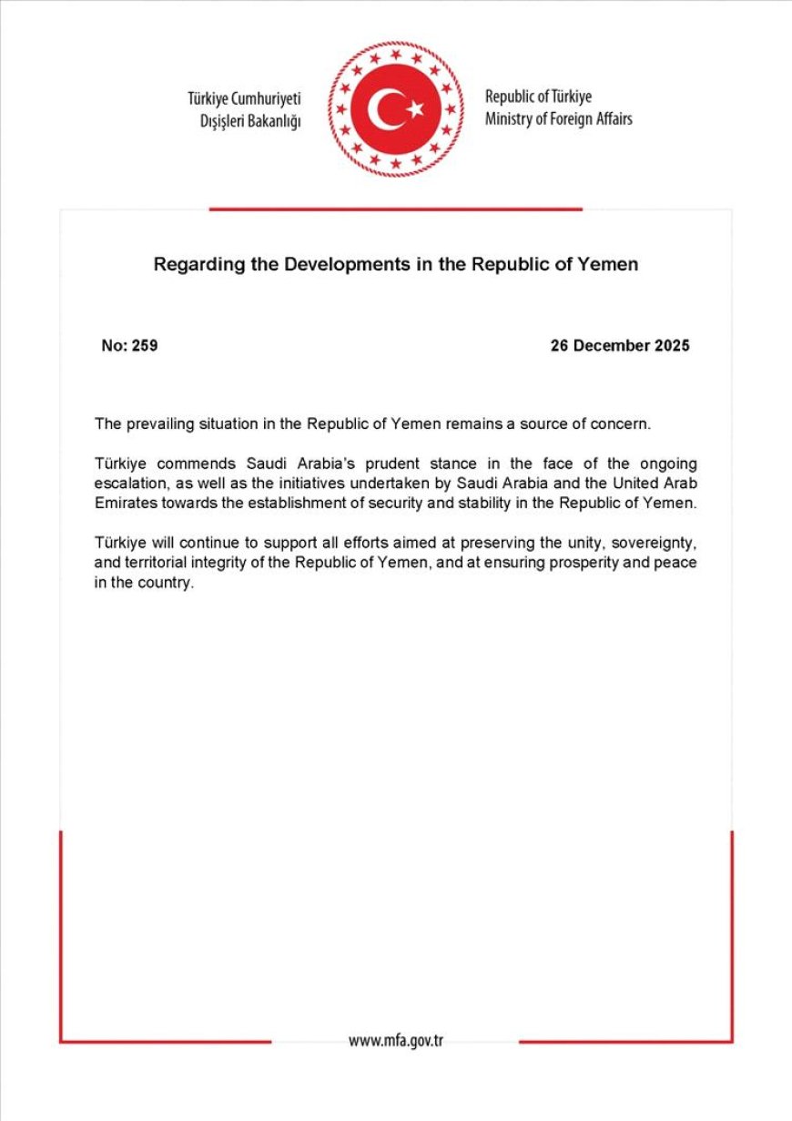 وجدد البيان تأكيد تركيا على موقفها الثابت والداعم لوحدة اليمن وسيادته وسلامة أراضيه، مشدداً على أن أنقرة ستواصل مساندة كافة الجهود الدبلوماسية التي تضمن تحقيق السلام والازدهار للشعب اليمني الشقيق، بما يكفل استقرار البلاد على المدى الطويل.