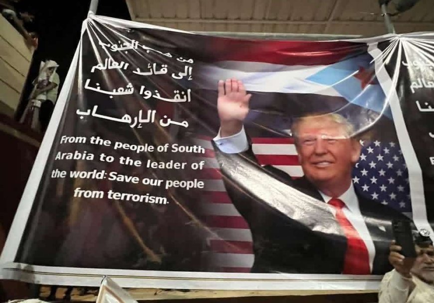 ورافق الصورة لافتة كبيرة كُتب عليها باللغتين العربية والإنجليزية: “من شعب الجنوب إلى قائد العالم”، في خطوة أثارت تفاعلاً واسعاً وجدلاً في أوساط الناشطين والمتابعين.