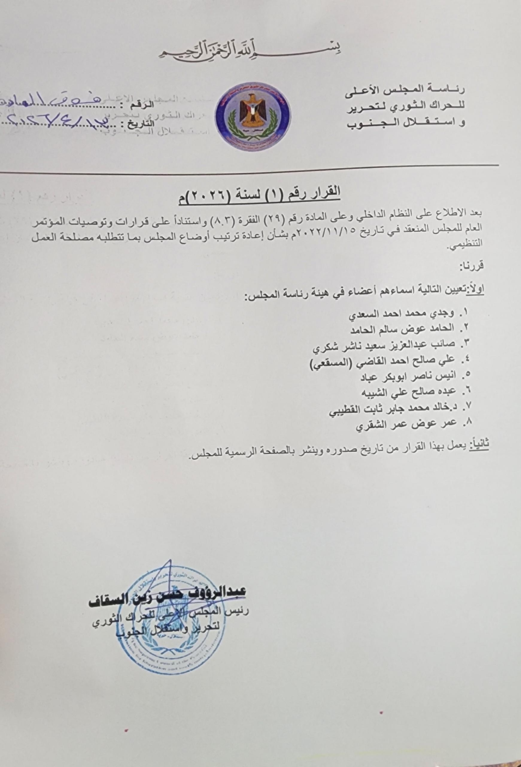ضمن مسار إعادة التنظيم وترتيب قيادات وقواعد المجلس الأعلى للحراك الثوري، أصدر رئيس المجلس الأعلى للحراك الثوري الأستاذ عبدالرؤوف السقاف قراراً بتعيين أعضاء هيئة رئاسة من شخصيات قيادية سياسية وأكاديمية على مستوى الجنوب، وذلك في إطار خطة شاملة تهدف إلى الارتقاء بأداء العمل الثوري وتعزيز حضوره في المرحلة القادمة.