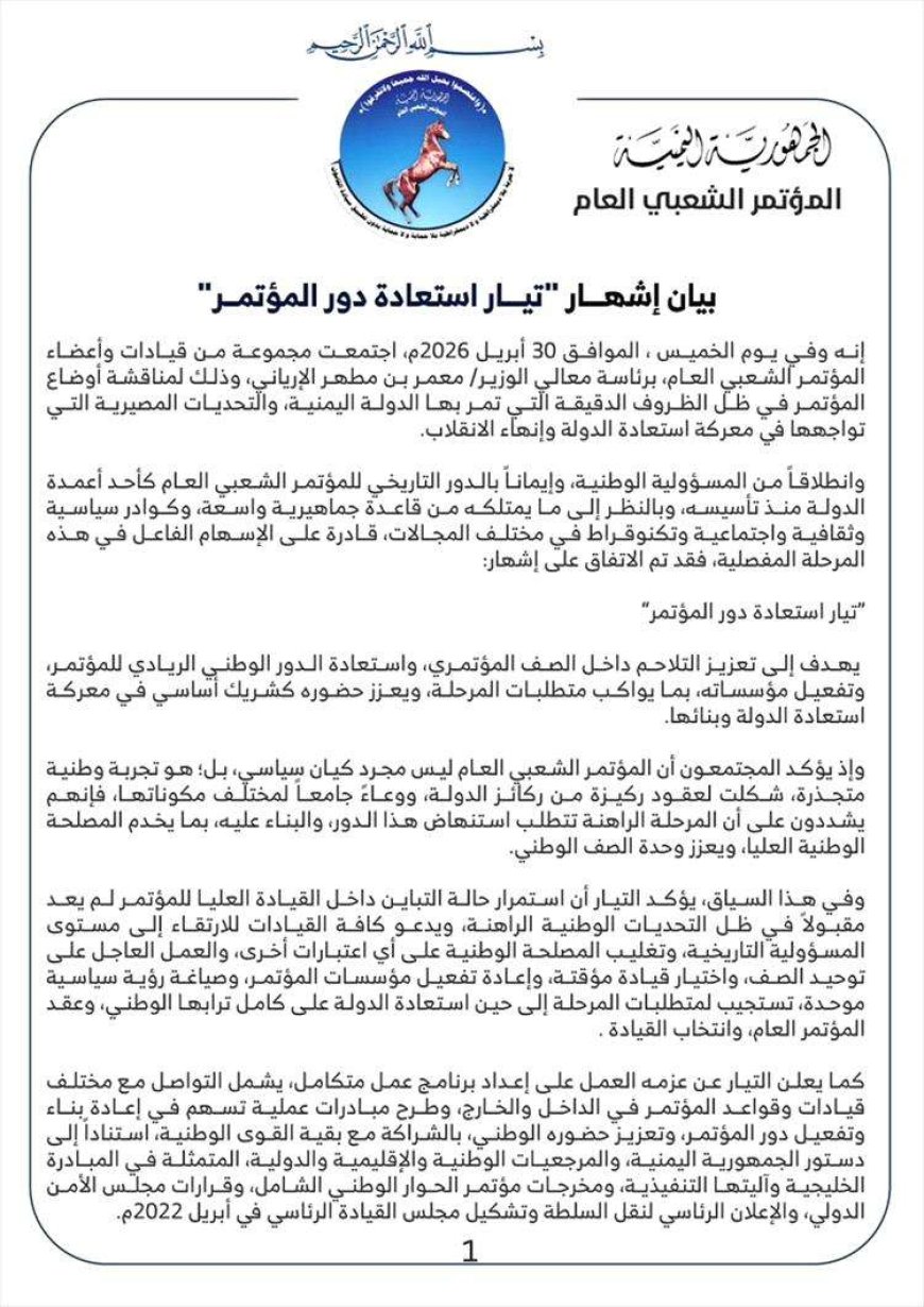 ​وأوضح “تيار استعادة الدور” عزمه فتح قنوات تواصل واسعة مع كافة قيادات وقواعد المؤتمر في الداخل والخارج دون استثناء، مشدداً على أن هذه المبادرة هي “خطوة تصحيحية” لاستنهاض مكانة الحزب التاريخية كركيزة للدولة اليمنية، وفتح آفاق الشراكة مع مختلف القوى الوطنية لإنقاذ اليمن في هذه المرحلة المفصلية.