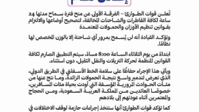 أعلنت قوات الطوارئ – الفرقة الأولى، عن منح فترة سماح محددة بـ24 ساعة لكافة القاطرات والشاحنات المخالفة، لتصحيح أوضاعها والالتزام…